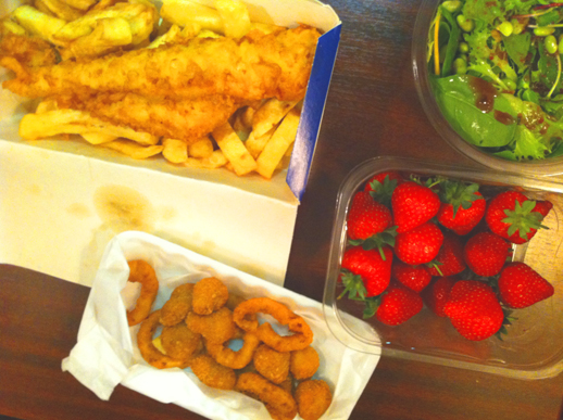 ホテルに到着後、ケンジントンガーデンをお散歩。7時くらいまで歩いて、ホテル近くのマークスアンドスペンサーで晩御飯と明日の昼ごはんまで買って、ネットで探したおいしいフィッシュアンドチップスをテイクアウェイしてホテルで晩御飯しました。うまかった! しかし揚げ物は重かった。おいしかったのでもう一回くらい食べたかったんだけど、これっきりでした。(後悔1)
